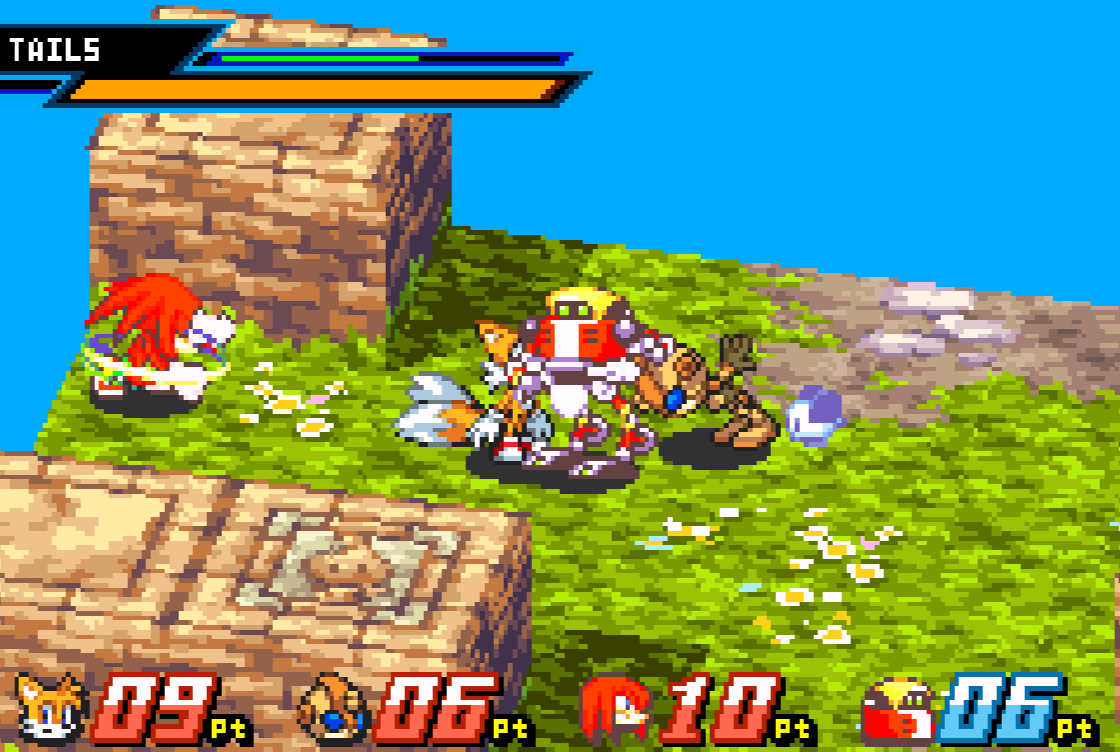 The game’s visuals and presentation are quite nice. Story scenes feature large, colourful representations of characters and the game's overworld map, which you navigate between battles, is well illustrated. During battle, Sonic and his mates are represented by cute little sprite versions of themselves. Similar to those seen in the Advance games, they are impressively animated given their diminutive size with lots of different animations, including lots of unique moves for each character. The real stars, though, are the arenas. Each arena is a 3D space in which the 2D combatants fight. Given the technology of the GBA, it's pretty impressive seeing these arena's realised as nicely as they are. I was constantly surprised how well the camera kept up with the action, rotating and panning so you always have a decent view of the pummelling.