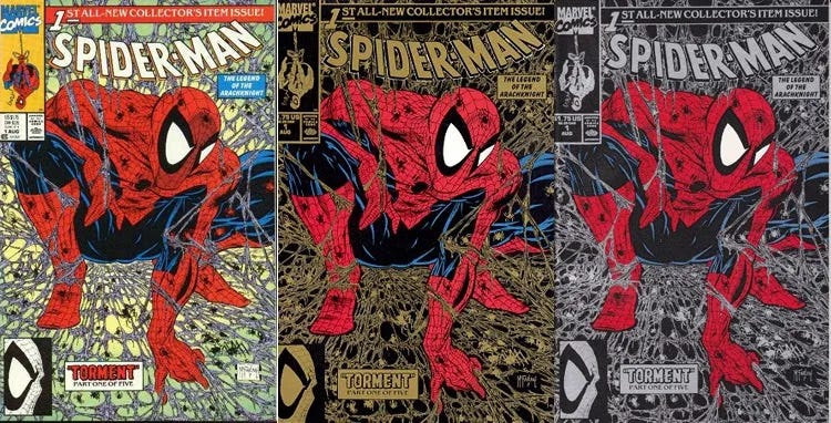 Due to the surge in demand for comic books, particularly rarer issues, publishers began to create more and more “special” editions of their product. Not only did these include covers with varying artwork, but also “enhanced” editions such as holofoil covers and polybaged issues. Spider-Man #1, the first issue of the adjective-less series drawn by the hottest artist of the 90’s, Todd McFarlane, had 13 variant covers alone.